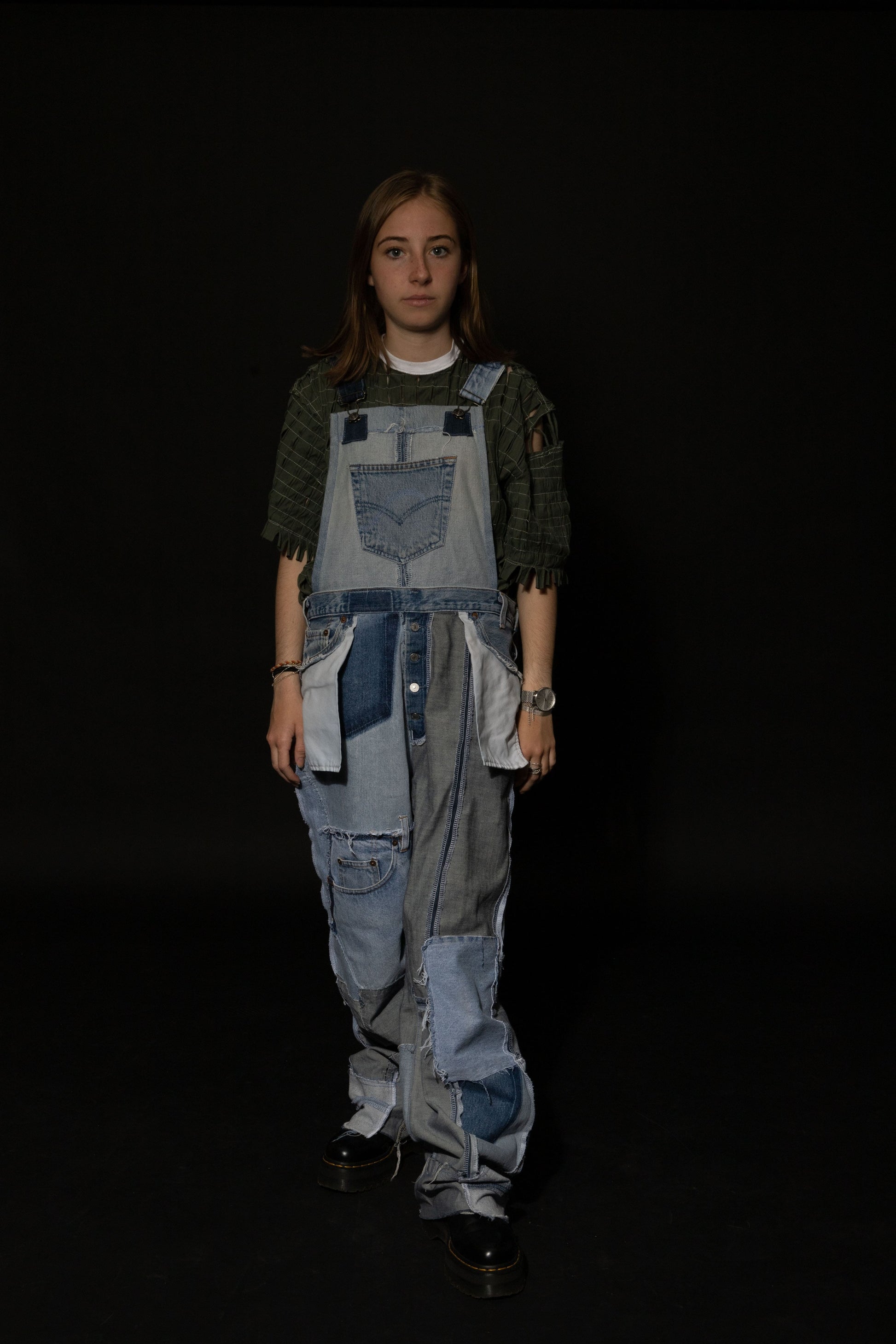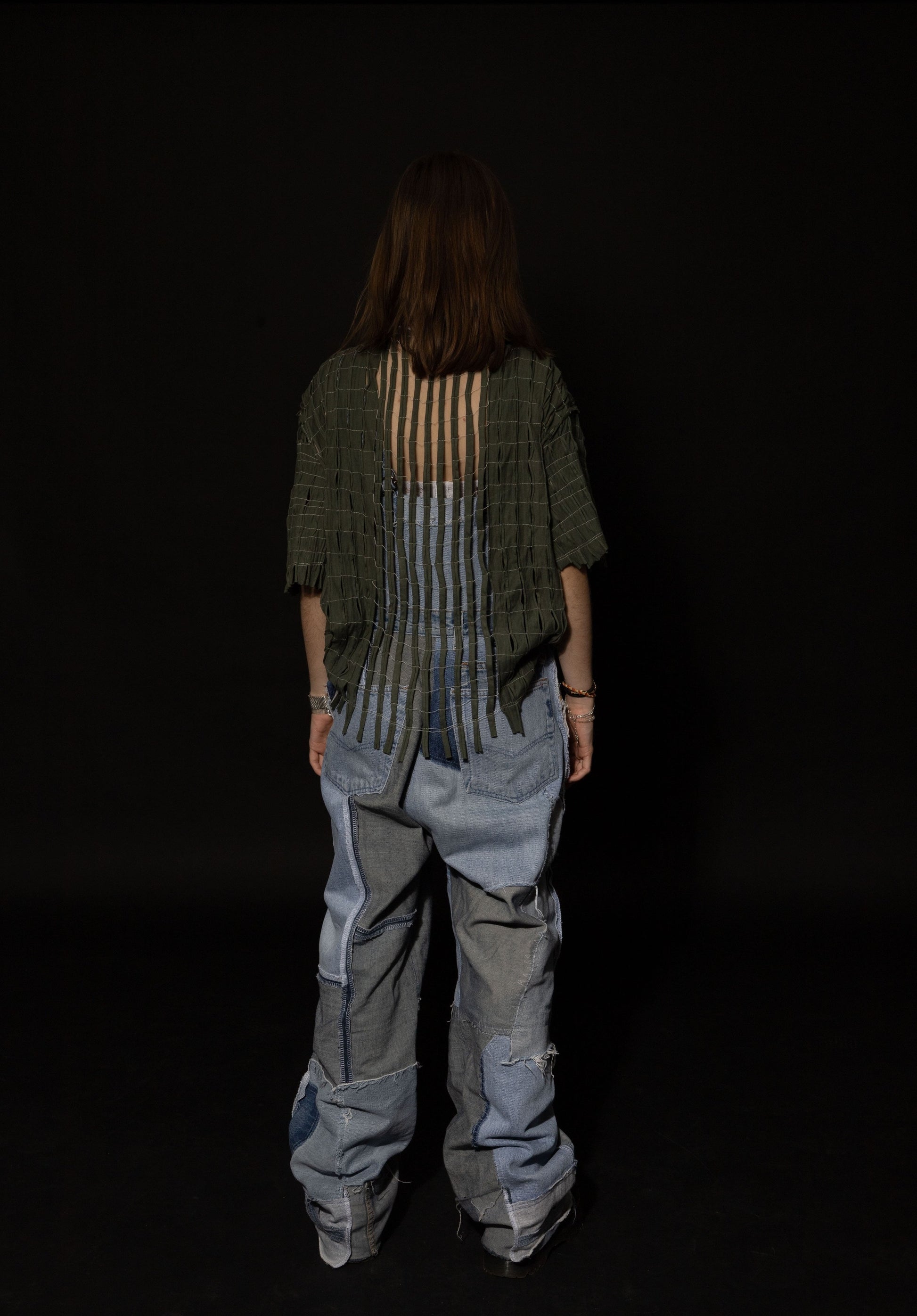 Patchwork de jeans désorganisé, effilochés, brute. Effet de denim retourné grâce aux sacs de poches, sous-pont et valeurs de coutures, tournés vers l'extérieur. Boutons, pattes de boutonnage et poches issus de recyclage.