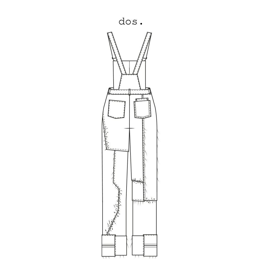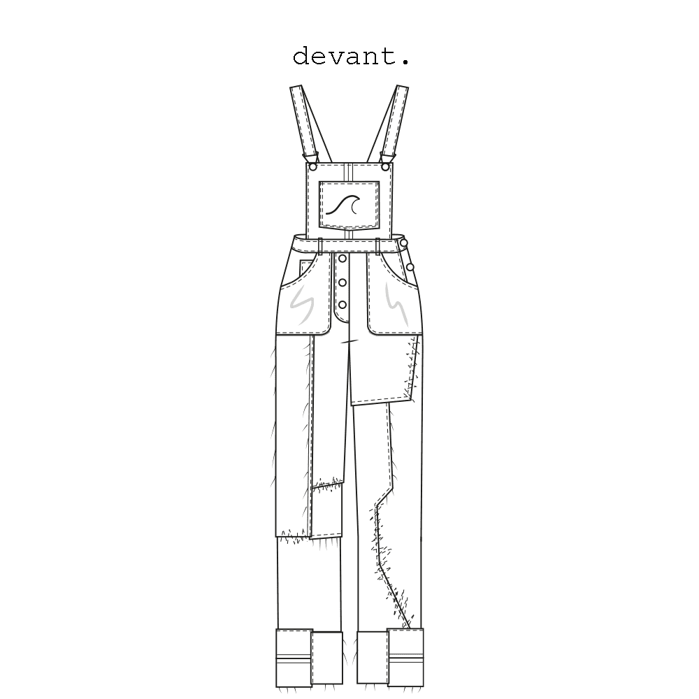 Salopette longue. Bretelles réglables. Boutonnage sur le côté gauche. 2 poches extérieures devants. 3 poches plaquées dos. 1 poche plaquée milieu devant avec broderie Sa(uva)ge. Étiquette en cuir avec œillet Sa(uva)ge.